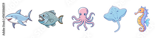 Cartoon Illustration of Ocean Animals - Hand-drawn illustrations of a shark, piranha, octopus, stingray, and seahorse, showcasing vibrant and playful marine life designs.