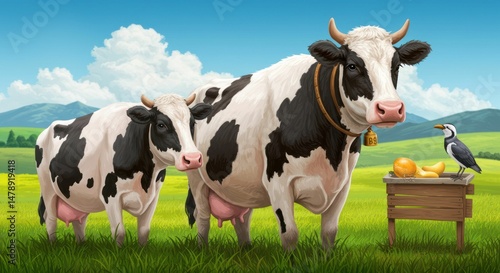 cow, pasture, black-and-white, holstein, cattle, countryside, rural, animal, meadow, field, farm, landscape, sky, grass, farm animal, idylli, cartoon, bird, magpie, fruit
