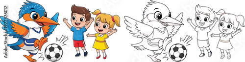 Cartoon Kingfisher Bird Playing Soccer with Happy Kids Coloring Page Included