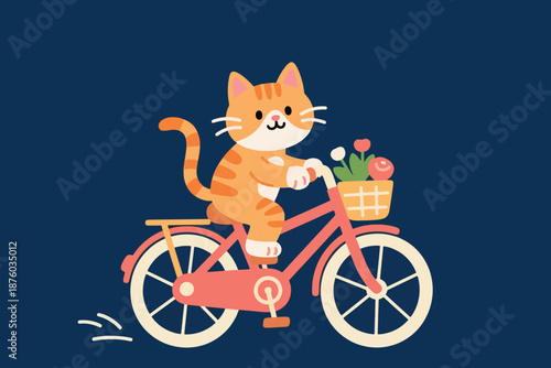 Cartoon orange tabby cat riding pink bicycle with flowers and apple in basket on dark blue background.