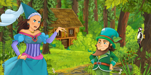 cartoon scene with happy dwarf traveling and encountering princess sorceress and hidden wooden house in the forest - illustration for children