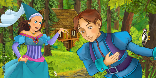 cartoon scene with young prince traveling and encountering princess sorceress and hidden wooden house in the forest - illustration for children