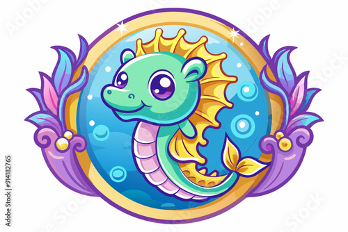 seahorse, cartoon, cute, underwater, ocean, aquatic, marin, life, animal, creature, fish, sea, oceanic, water, wildlife, nature, seaweed, coral, reef, gold, crown, frame, circle, round, blue, turquoise, white, yellow, purple, pink, green, illustration, art, design, digital, graphic, vector, clip art, icon, symbol, adorable, sweet, happy, smiling
