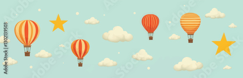 Cartoon Sky with Hot Air Balloons, Clouds and Stars, transparent background