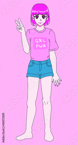 Cartoon slylish anime girl showing victory hand gesture. Modern trendy personage.