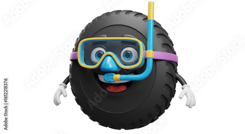 tire, character, cartoon, aqualung, diving, snorkel, goggles, fun, summer, isolated, illustration, happy, adventure, playful, cheerful, leisure, activity, three-dimensional, design, graphic, entertainment, amusement, digital, creative, smiling, graphic design, image, object, technology, humor, positive