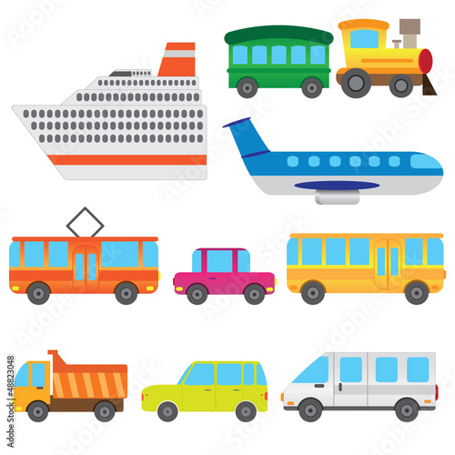 tram, bus, plane, ship, car, van, truck, cartoon, children, isolated, object, fun, preschool, green, white, blue, toy, red, yellow, background, train