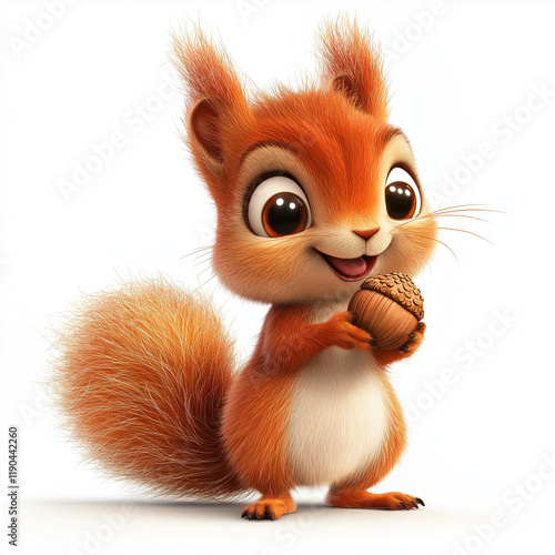 Cartoon-style red squirrel clipart with a three-dimensional effect. Bright reddish-brown fur, a big bushy tail, oversized shiny eyes, and an adorable happy face. Holding an acorn