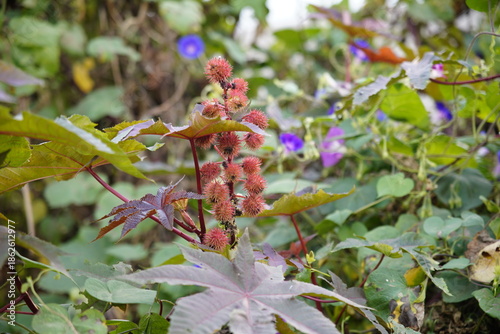 Castor oil plant (Ricinus communis) castor bean tree in garden