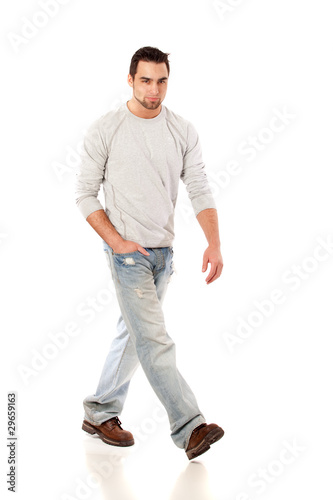 person, one person, man, male, adult, young adult, 20s, caucasian, white, on white, studio, studio shot, model, casual attire, jean, sweatshirt, grey, grey, walking