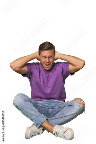 Casual man sitting on floor covering ears with hands trying not to hear too loud sound.