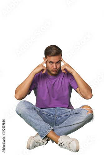 Casual man sitting on floor focused on a task, keeping forefingers pointing head.