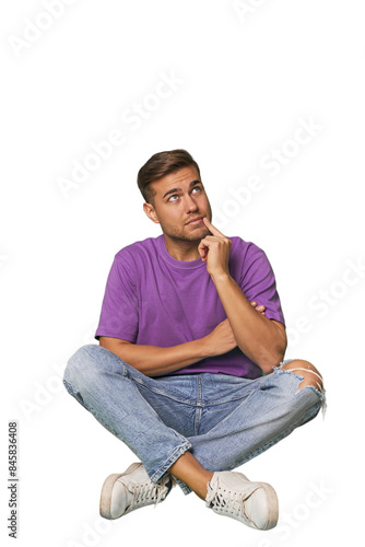 Casual man sitting on floor looking sideways with doubtful and skeptical expression.