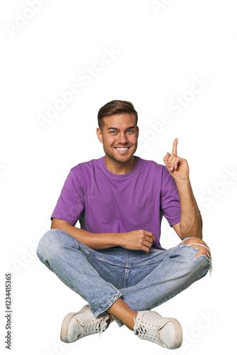 number, happy, showing, confident, hand, mathematic, 1, index, 1, counting, summing, gesture, smiling, first, idea, signs, cheerful, finger, symbol, subtract, young, caucasian, man, sitting, floor, studio, casual attire, relaxed, posture, alone, model, fashion, style, modern, trendy, individual, seated, comfortable, leisure, chill, profile, glance, sharp, attire