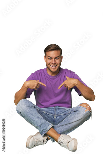celebrate, health-giving, advantageous, finger, successful, glad, shocked, pointing, amazed, reaction, lucky, concept, fortuitous, helpful, indexed, wow, cheerful, gesture, flourishing, auspicious, young, caucasian, man, sitting, floor, studio, casual attire, relaxed, posture, alone, model, fashion, style, modern, trendy, individual, seated, comfortable, leisure, chill, profile, glance, sharp, attire