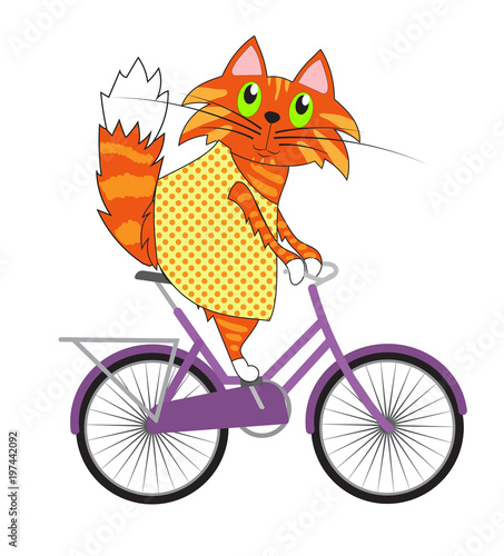 Cat on a bicycle, vector illustration. Ginger kitty on a violet bicycle. Cartoon spring illustration.