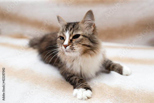 Cat with white and dark, brown fur squinted. Lying on the couch. Pretty kitten indoor in relax.