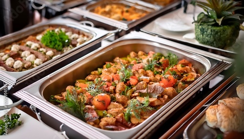catering buffet food catered banquet in restaurant, meat and vegetables