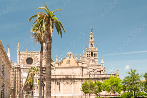 seville, cathedral, seville, spain, architecture, church, facades, europa, landmark, spanish, travel, building, gothic, sky, tower, catholic, european, andalusia, andalusian, christian, historic, ancient, blue skies, exterior