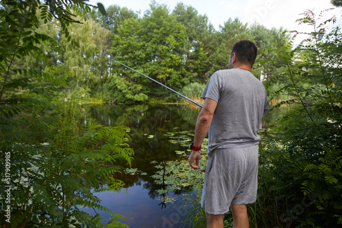 Caucasian adult man fishing on the river with beautiful view of landscape.