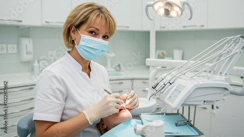 Caucasian female dentist performing procedure in dental clinic Bright atmosphere emphasizes healthcare, professionalism, and patient care