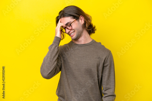 man, man, people, person, male, model, guy, photogenic, youth, young, adult, brunette, 1, portrait, long, hair, coiffure, caucasian, background, isolated, wall, colours, colourful, yellow, happy, laugh, funny, laughing, smile, happiness, expression, gesture, good, positive, proud