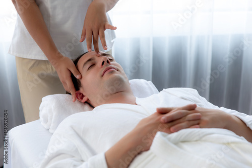 Caucasian man enjoying relaxing anti-stress head massage and pampering facial beauty skin recreation leisure in dayspa modern light ambient at luxury resort or hotel spa salon. Quiescent
