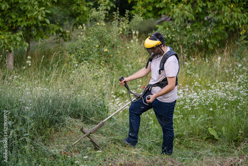 caucasian man farmer using string trimmer to cut grass brush cutter