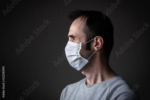 Caucasian man wearing a white medical mask for protection against contagious disease, coronavirus
