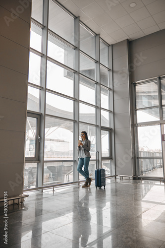 Caucasian woman is standing alone near airport terminal panoramic windows with luggage