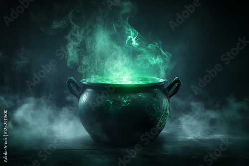 Cauldron with green glowing potion isolated on a dark foggy background