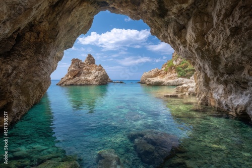 Cave entrance view of turquoise sea and rocky formations