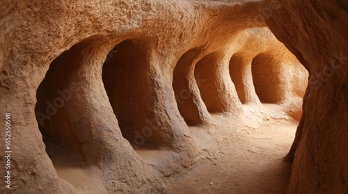 Cavernous tunnels carved into earthy walls create unique underground landscape. warm light illuminates textured surfaces, evoking sense of mystery and exploration