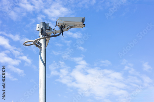 CCTV outdoor camera, building security guard. area safety surveillance cam with blue sky background