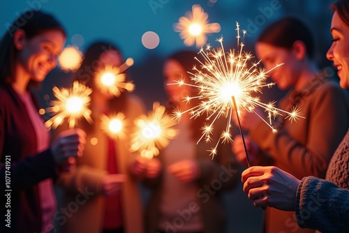 Celebrate with Friends: Joyful Moments of Sparkler Fun under Night Sky, Perfect for Holiday Greetings and Memories