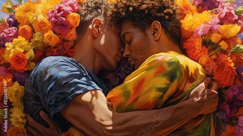 pride, hugs, love, gay, couple, diversity, equality, affection, inclusion, support, oneness, acceptance, identity, rainbow, flag, human relationships, happiness, embracing, homosexuality, romantic, floral, design, isolated, connected, digital, illustration, artwork, vibrant, colours