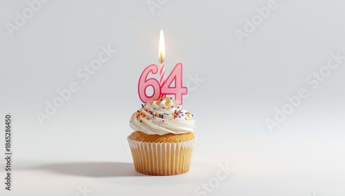 Celebratory cupcake featuring a number 64 candle, festive occasion