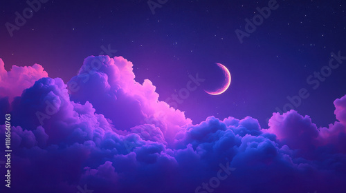 Celestial Dreamscape: A crescent moon graces a breathtaking night sky, adrift in a sea of vibrant purple and pink clouds. An ethereal and calming image perfect for fantasy, dreams, and tranquility.