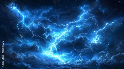 Celestial Lightning Storm Digital Art Composition, Blue Hues, Dramatic Cloudscape, Night Sky, Energy, Power lightning, storm