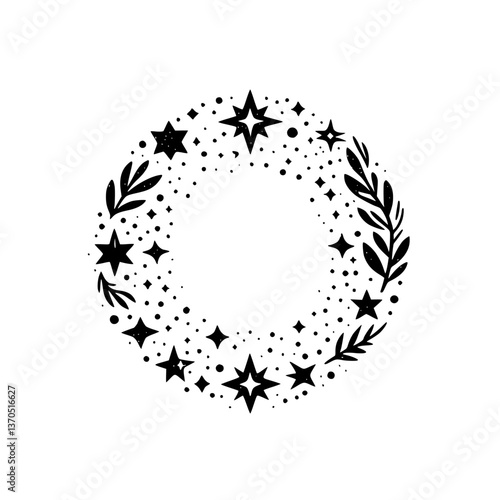 vector, chaplet, star, leaf, branch, dot, celestial, black-and-white, minimalist, illustration, graphic, design element, frame, decoration, christmas, holiday, invitation, wedding, card, logotype, hand-drawn, rustic, nature, elegant, space