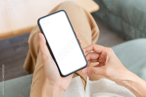 cell phone blank white screen mockup.woman hand holding texting using mobile on desk at office.background empty space for advertise.work people contact marketing business,technology