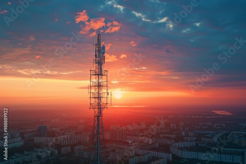 cellular communications tower on a background of the city and a beautiful sunset in summer