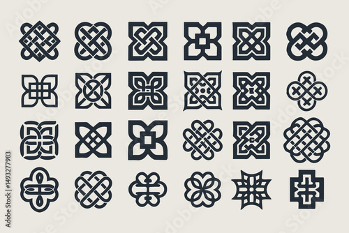 Celtic and Tribal Knot Symbols Vector Set. Black Thick-Line Ornaments with Loops, Crosses, Floral and Geometric Motifs Vector Illustration.