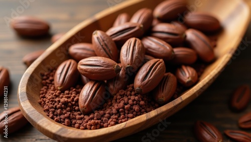 Ceremonial Cacao. Close-up of shiny brown pecans and crushed nuts in wooden spoon, natural healthy snack, organic food background, rustic kitchen setting, warm tones, perfect for culinary, nutrition,