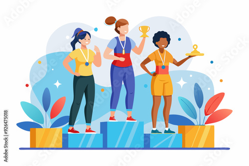 achievement, african, athlete, award, champion, championship, competition, ethnicity, first, game, gold, layout, marathon, medal, place, prize, reward, run, silver, succeed, success, three, victory, winner, people, second, sport, sprinter, bronze, cartoon, female, happy, illustration, isolated, pedestal, woman, adult, black, celebration, character, concept, design, girl, sportswoman, vector, flat, awarding, dais