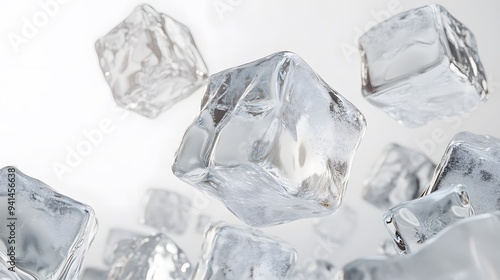 CG Floating Ice Cubes: Perfectly clear CG ice cubes hovering above a white background, with detailed textures and light reflections.