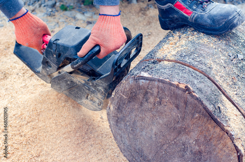 Chainsaw. The chainsaw cuts wood. A man cuts a saw cut from a tree. Slice. Wooden slab. Tree rings of the trunk. Lumberjack