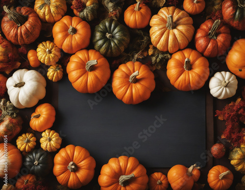 pumpkin, thanksgiving, blackboard, autumn, fall, topview, copy space, holiday, colourful, up high, assortment, background, blank, border, colours, corn, decoration, event, food, frame, halloween, harvest, indian corn, mini, november, occasion, october, orange, overhead, rustic, season, seasonal, variety, vegetable, wood, wooden, pumpkin, farm, squash, agriculture, vegetable, market, produce, gourd, patch, fruit