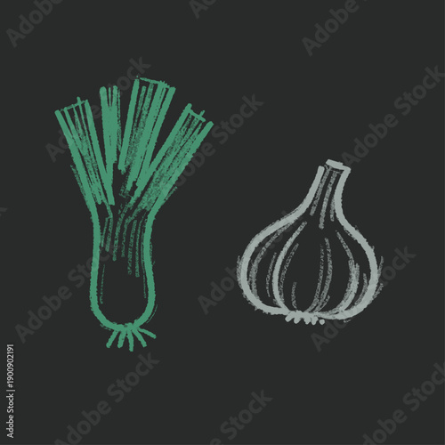 Chalk-style vector illustration depicting fresh green leek and a garlic bulb, ideal for culinary designs or healthy food concepts
