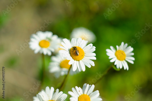 Chamomile flower field. Camomile in the nature. Field of camomiles at sunny day at nature